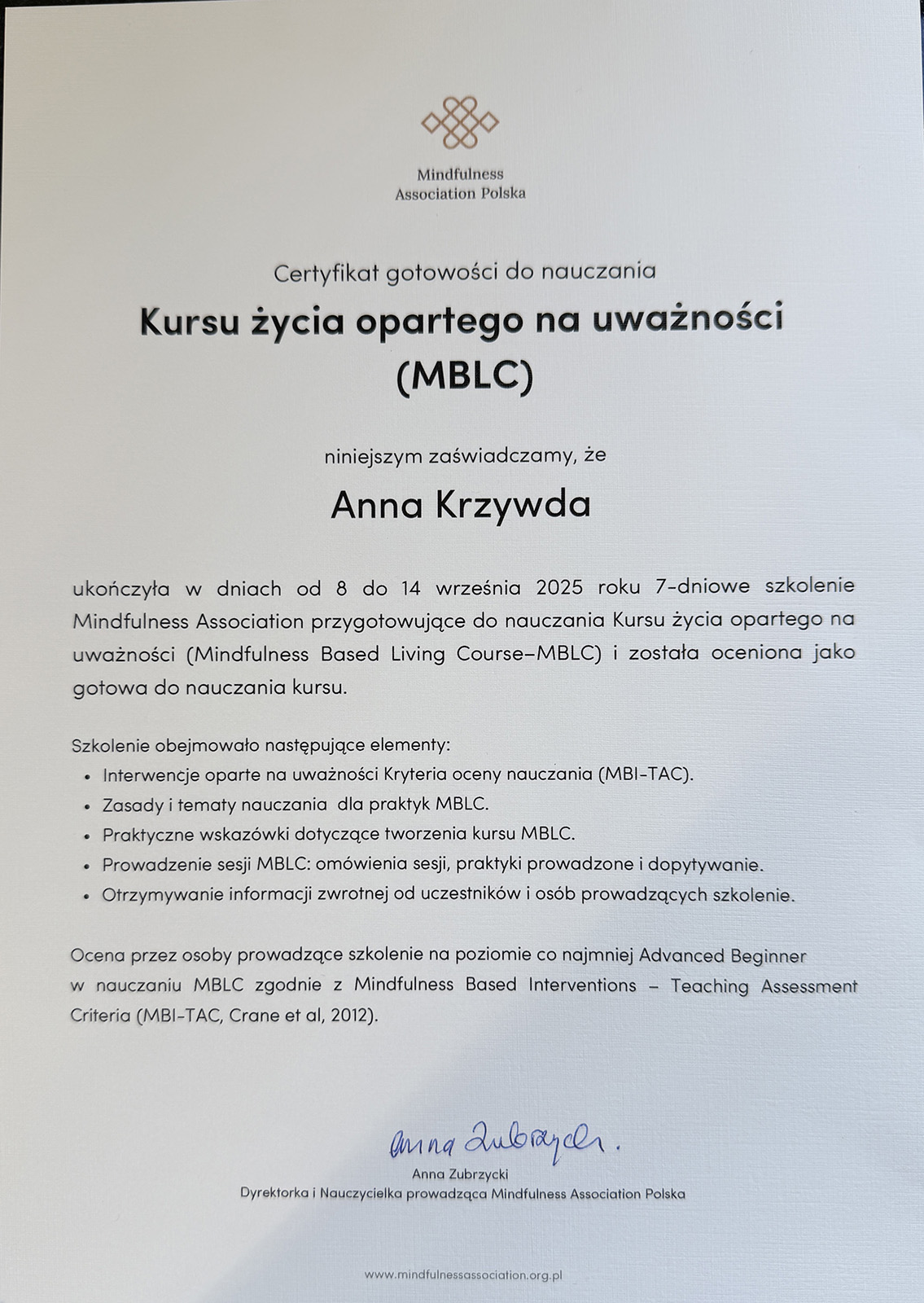 Nazywam się Anna Krzywda i jestem nauczycielką kursów MBLC – Mindfulness Based Living Course.